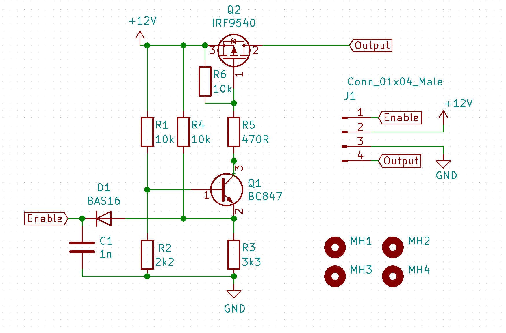 Making use of the very cheap PCB offers currently available I have made a simple high side switch to connect 12V on grounding, e.g to drive a relay or a small amplifier. Its limited by its lack of heatsinking to a couple of amps. I will put the gerbers in the files area on the Wiki. I built one up with an IRF9540 rather than an IRF9520 as the higher current devices were more available. To switch more power, heatsinking of the device will be required - that's fairly easy to do with the TO220 versions of the devices, keeping the high current paths off the PCB.